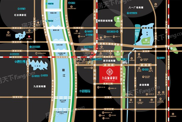 目位于象湖路以南、抚生东路以东、桃花西路以西、象湖二路以北,与九龙湖隔江而立、与大朝阳南北相承,雄踞两大热力板块资源中轴交汇处,生米大桥、九龙湖隧道(规划)、沿江快速路畅通接驳;拥揽新洪大、一附院、产业园、莲一中等城市级配套拱卫。
